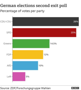 Sipas exit-polleve të publikuara nga mediat gjermane deri më tani, Laschet i CDU-CSU kryeson me 25-26% të votave ndërkohë që partia socialdemokrate, SPD mbetet në kuotat e 25%.