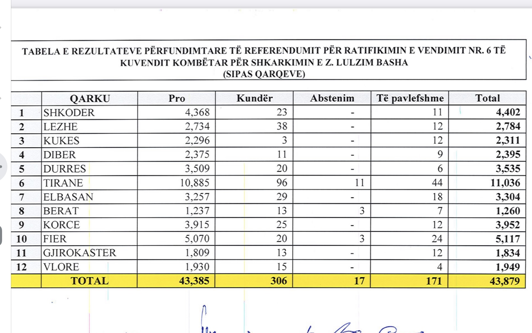 Rezultatet e referendumit, shkarkohet Basha, votat kundër minimale