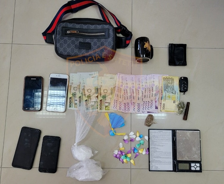 Gjatë kontrollit fizik ndaj shtetasit E. Gj. dhe më pas në banesën e tij (ku ndodhej shtetasja I. N., e cila paketonte lëndën narkotike në doza), shërbimet e Policisë gjetën dhe sekuestruan në cilësinë e provës materiale 170 gramë lëndë narkotike e dyshuar kokainë, një pjesë e saj e ndarë në doza gati për shitje, 18 doza me lëndë narkotike heroinë, doza me cannabis sativa, 90.000 lekë të rinj, 4 aparate celulare, 1 automjet, 1 peshore elektronike dhe sende të tjera që shërbenin për paketimin e lëndës narkotike në doza.