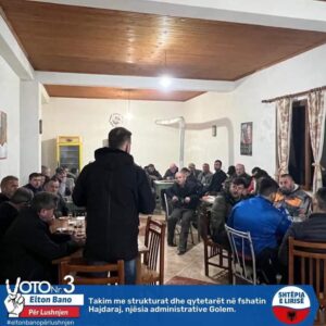 Kandidati i ‘Shtëpisë së Lirisë’, Elton Bano po zhvillon cfo dite e çdo orë takime me fermere e qytetarë në Lushnje ndërsa është takuar së fundmi me qytetarët në fshatrat Hajdaraj dhe Allprenaj të, njësisë administrative Golem.