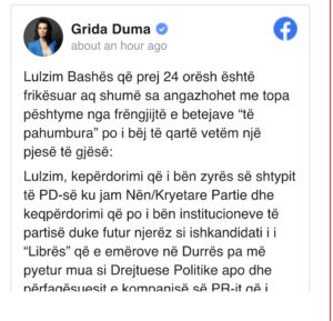 Nënkryetarja e PD, Grida Duma përmes një postimi në rrjete sociale tha se gjatë fushatës Lulzim Basha refuzoi të denonconte aferën e Durrësit ndërsa caktoi drejtues të fushatës një ish funksionar të Libra-s.