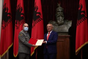 Më poshtë janë disa foto ku ai ka marrë gradën e lartë dhe dekreti i Presidentit Meta.