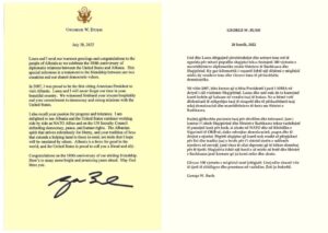 Unë dhe Laura ju dërgojmë përshëndetje dhe urimet më të ngrohta për mbarë popullin shqiptar teksa festojmë 100-vjetorin e marrëdhënieve diplomatike midis Shteteve të Bashkuara dhe Shqipërisë, ky gur kilometrik i veçantë është një dëshmi i miqësisë midis dy vendeve tona dhe vlerave tona të përbashkëta demokratike. Në vitin 2007 isha krenar që u bëra presidenti i parë i Shteteve të Bashkuara që vizitonte Shqipërinë. Laura dhe unë nuk e harrojmë kurrë kohën që kaluam në vendin tuaj të bukur. Ne u bëmë vetë dëshmitarë të mikpritjes suaj të sinqertë dhe të përkushtimit tuaj ndaj demokracisë dhe marrëdhëniet e forta me Shtetet e Bashkuara.