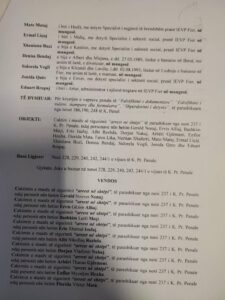 16. S.V me detyre specialist i sektorit social e dyshuar për kryerjen e veprave penale ”Falsifikim i dokumenteve”, “Falsifikim i vulave, stampave dhe formularëve”, “Shpërdorim detyre”, parashikuar nga nenet 186, 190 dhe 248 të K.Penal. (Në cilësinë e specialistit të sektorit social duke qenë anëtar në komisionin e vlerësimit të sjelljes në bashkëpunim me sektorë të tjerë në IEVP Fier, pasqyrojnë të dhëna të rremë në lidhje me procesin e rehabilitimit të dënuarve nga të cilat janë përfituar ulje dënimi në gjykatë në 4 raste).