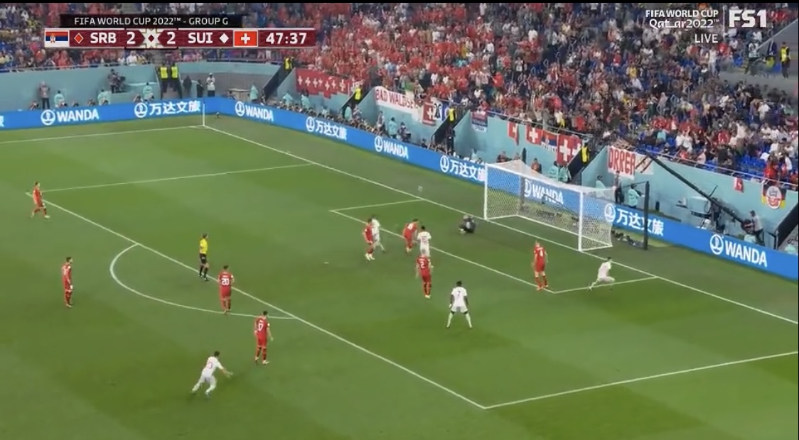 Pranë përfundimit të pjesës së parë, konkretisht në minutën e 44-të, Embolo shënon golin e barazimit duke i dërguar të dyja ekipet në dhomat e zhveshjes me rezultatin 2-2.
