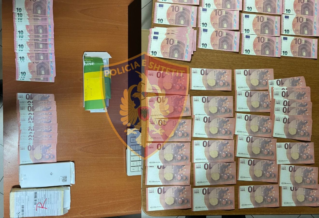 Gjatë kontrollit fizik, shërbimet e Policisë i kanë gjetur këtij shtetasi, 950 euro të falsifikuara, të cilat u sekuestruan nga Policia, së bashku me shumën e eurove që u gjet në pako. a.b