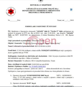 REHABILITIMI I INFRASTRUKTURES SE RRJETIT NE ZONEN E PORTO ROMANOS-KËNETË DHE SISTEMIMIN E RRJETIT TË UJRAVE TË SHIUT NË ZONËN URBANE TË QYTETIT TË DURRËSIT FAZA I (Programi i Rindërtimit) me vlerë 2.3 miliard lekë ose mbi 20 milion euro vetëm për një kontratë, për këtë kontratë. Kontrata u fitua me 99.9% të vlerës limit.