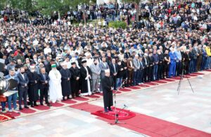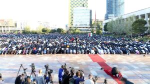 Një numër i madh myslimanësh në Tiranë falën sot namazin para Sheshit Skëndërbej në orën 06:55, siç edhe është bërë zakonisht.