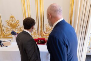 Po vij nga një përvojë e dendur para disa minutash, një ceremoni që s’e kisha imagjinuar kurrë në jetën time, që u nënshkrua me mbërritjen time në Francë në fillim të viteve ’90. Kur vija nga aeroporti, mbajta radhën gjatë për të gjetur një taksi, pastaj jetova ato vështirësi të mëdha të asaj kohe për të gjithë ata dhe ato që vinin nga Shqipëria, që kishin një pasaportë shqiptare sepse Europa nuk ishte e lehtë për ne në ato kohë. Pastaj mendoja se kisha parë gjithçka kur mbërrita një ditë i shoqëruar për të ardhur në këtë pallat për të marrë Legjionin e Nderit, por sot jam vërtetë shumë krenar, jo për veten, por krenar për Shqipërinë, për këtë miqësi mes Shqipërisë dhe Francës sepse ishte hera e parë në historinë tonë të marrëdhënieve diplomatike që një përfaqësues i shtetit shqiptar të pritej në këtë mënyrë dhe të falënderoj me gjithë zemër sepse kjo do të thotë vërtetë shumë për Shqipërinë dhe shqiptarët dhe për më tepër, – këtu bëmë pak shaka me ambasadorin sepse ishte një grup njerëzish, një ekip miqsh të Shqipërisë që asokohe në vitet ’90 ishin një numër shumë i vogël sa gishtat e një dore, – sot janë shumë më tepër, sot ka njerëz të shumtë që janë në Shqipëri për të investuar, për të zgjeruar ndërmarrjet e tyre dhe vërtet ky është një revolucion.