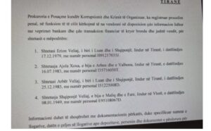 Në kërkesën e SPAK për bankat, kërkohet që të vendoset në dispozicion çdo informacion që lidhet me veprimet bankare dhe transaksionet financiare të kryera brenda dhe jashtë vendit për personat e cituar më lart.