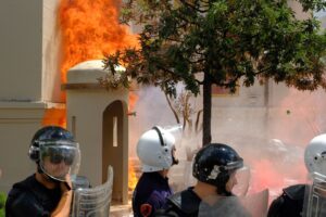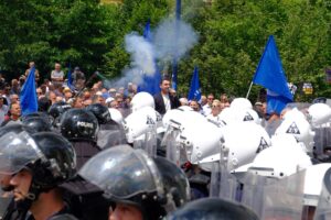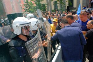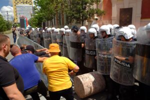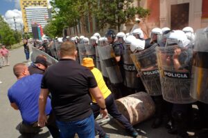 Duke i tërhequr me litarë protestuesit kanë tentuar të heqin mbrojtëset metalike të vendosur para bashkisë. Por nuk kanë munguar as flakadanë drejt policisë.