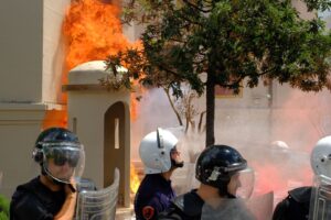 Një numër i madh qytetarësh po protestojnë para Bashkisë së Tiranës ndërsa kanë hedhur bomba molotov drejt godinës së bashkisë. Grumbuj me goma po digjen.