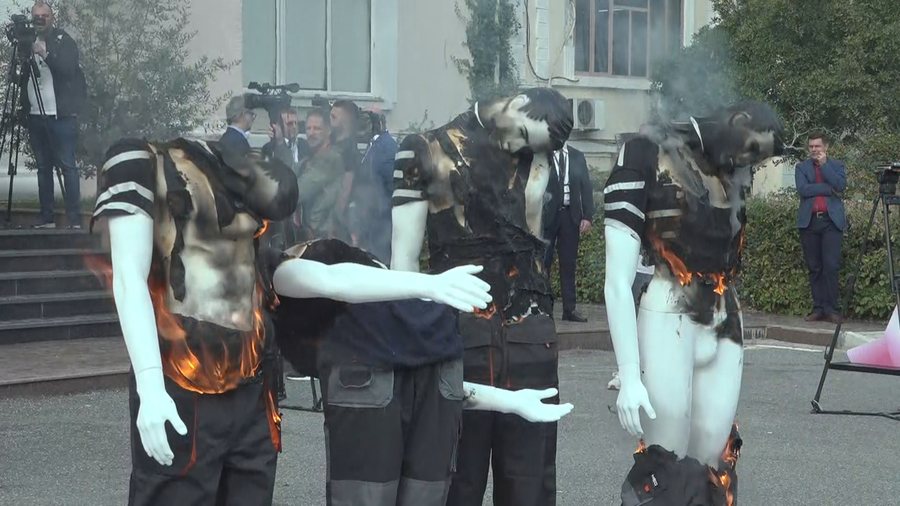 Katër manekinët ishin veshur me rroba burgu teksa ishin vendosur në to dhe fotot e Edi Ramës, vëllai të tij Olsi Rama, Fatmir Xhafajt dhe Geron Xhafajt. a.b