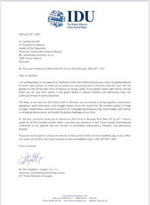 Dr. Berisha, ju ftoj sinqerisht të merrni pjesë në Forumin IDU në Bruksel nga data 14 deri më 16 maj. Jam i bindur se flas në emër të të gjitha partive anëtare të IDU-së kur them se prania juaj në këtë Forum do të ishte një kontribut i jashtëzakonshëm për agjendën tonë dhe për misionin tonë të përbashkët për promovimin e konservatorizmit, lirisë dhe demokracisë në nivel global.