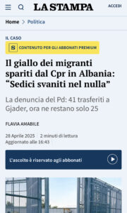 “Misteri i migrantëve që u zhdukën nga Qendra e Pritjes në Shqipëri: “Gjashtëmbëdhjetë u zhdukën në ajër”, shkruan që në titull gazeta e mafhe italiane “La Stampa”.