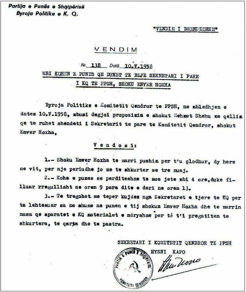 Në vitin 1958 Byroja Politike, pa diskutim dhe propozim, miratonte një vendim që kufizonte kohën e punës të sekretarit të parë.