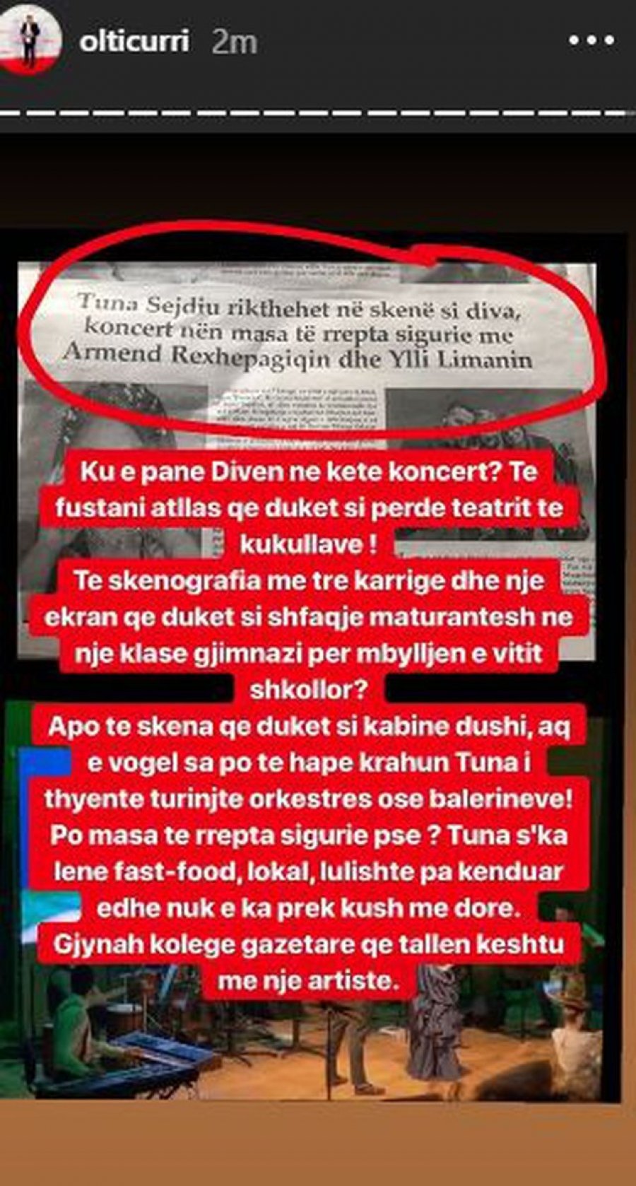 Apo tek skena që duket si kabinë dushi, aq e vogël sa po të hapë krahun Tuna , i thyejnë turinjtë orekstrës dhe balerinëve.Po masa sigurie pse? Tuna s’ka lënë fast –food pa kënduar dhe nuk e ka prekur kush me dorë.Gjynah kolegë gazetarë që tallen kështu me një artiste’ e mbyll postimin Olti.