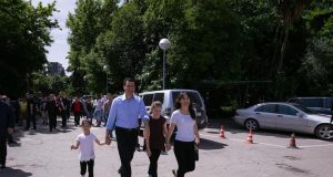 Kreu i PD-së i shoqëruar nga familja e tij, nga bashkëshortja Aurela dhe dy vajzat, Dafina dhe Viktoria, ka lënë selinë e PD-së.