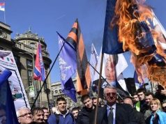 Serbët në protestë, djegin flamujt e NATO-s, SHBA, BE e Kosovës në 16 vjetorin e bombardimeve