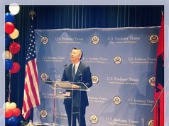 Pas konfirmim zyrtar të fitores së Donald Trump si president i SHBA-ve, në ambientet e ngritura nga Ambasada amerikane në Tiranë, për të përcjellë...